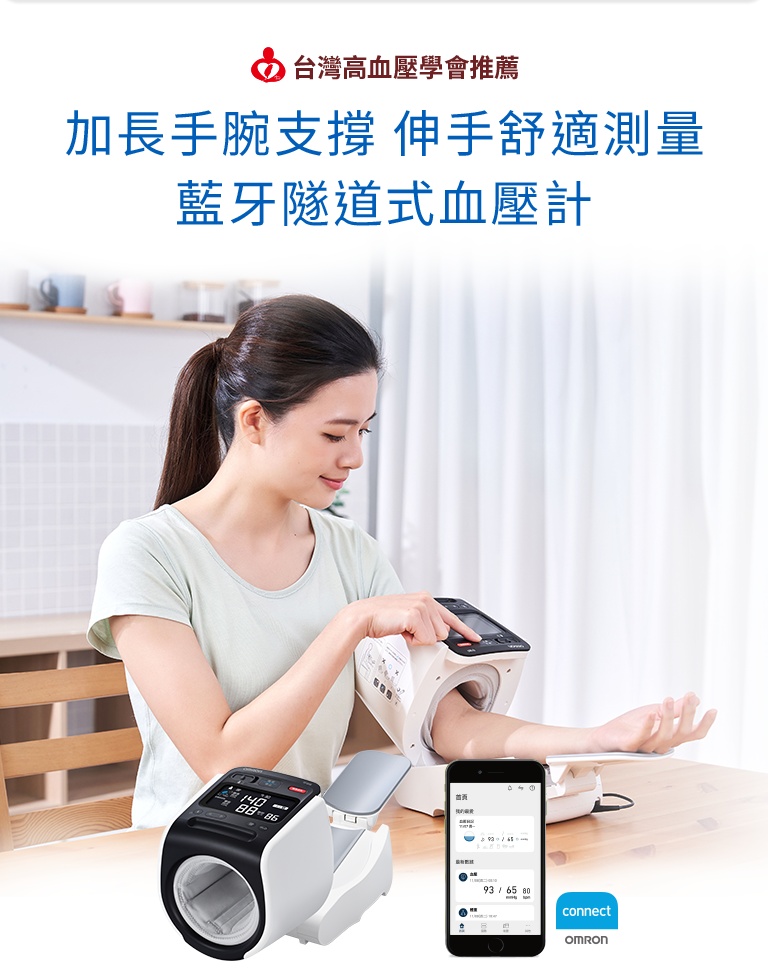 產品具有藍牙傳輸功能,將量測數據上傳至「OMRON connect」。輕鬆查看血壓變化,省去紀錄血壓數值的麻煩,更方便於看診時提供給醫師判斷。