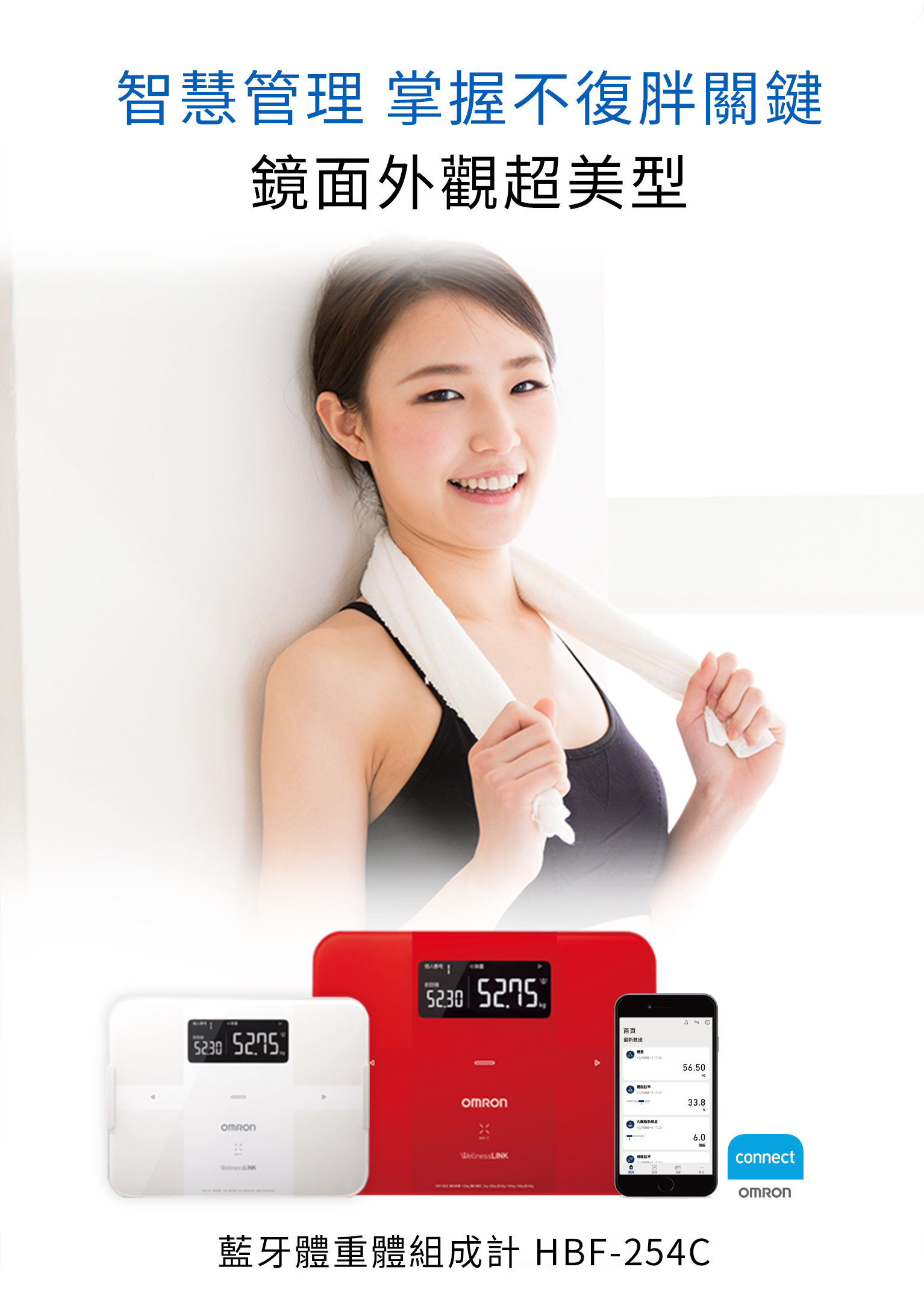 產品具有藍牙傳輸功能。將量測到的數據上傳至「OMRON connect」,輕鬆查看體組成變化。