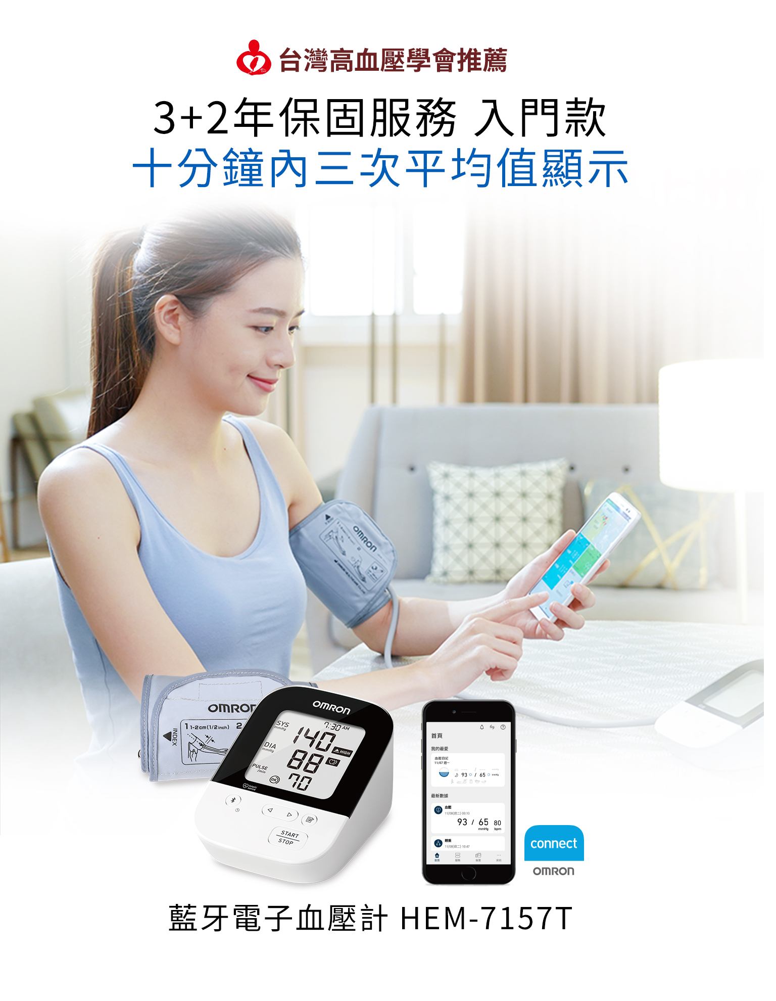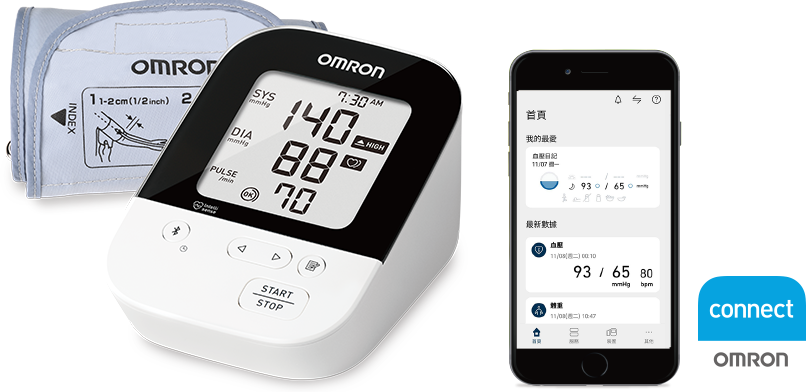 產品具有藍牙傳輸功能,將量測數據上傳至「OMRON connect」。輕鬆查看血壓變化,省去紀錄血壓數值的麻煩,更方便於看診時提供給醫師判斷。