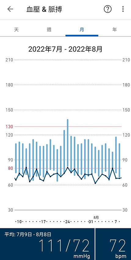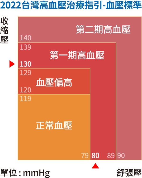 2022年高血壓指引標準以家庭血壓值做高血壓診斷與控制治療依據,血壓標準140/90mmHg下修至130/80mmHg,超過即是高血壓。